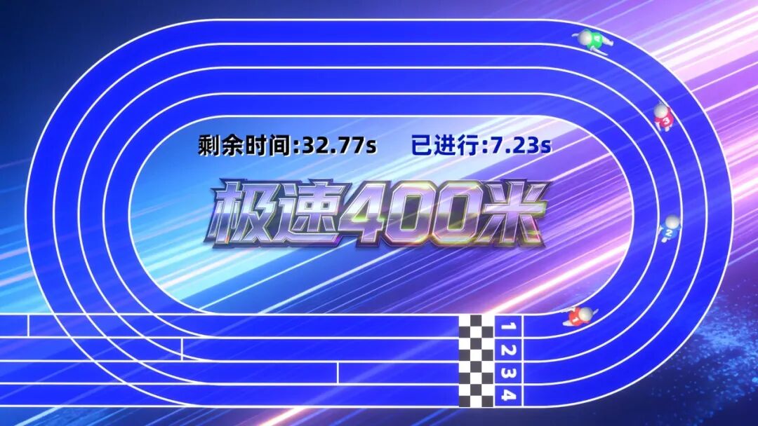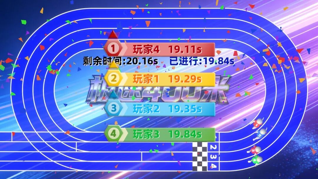 玩家用双脚快速踩踏压感装置,控制对应角色同步向前奔跑,跑完一圈(400米)最先到达终点获胜。